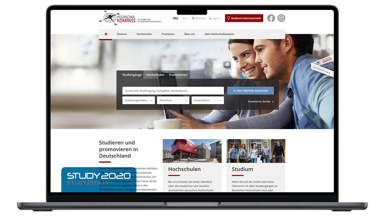 Hochschulkompass یک وبسایت رسمی است که پایگاهداده مؤسسات آموزش عالی در آلمان را ارائه میدهد. شما میتوانید دانشگاهها را بر اساس مکان، رشته تحصیلی و برنامههای تحصیلی جستجو کنید. همچنین اطلاعاتی در مورد شرایط پذیرش، بورسیه تحصیلی و جزئیات تماس ارائه میدهد.